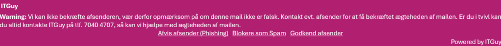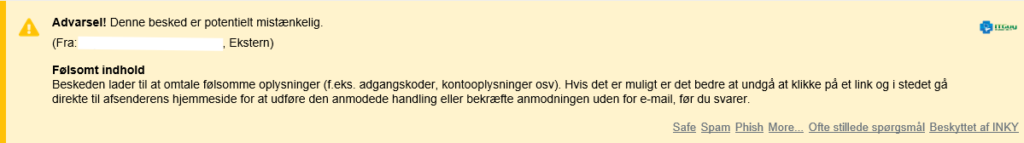 Bannere indsættes automatisk af INKY for at gøre dig opmærksom på, om en e-mail virker sikker eller potentielt farlig.