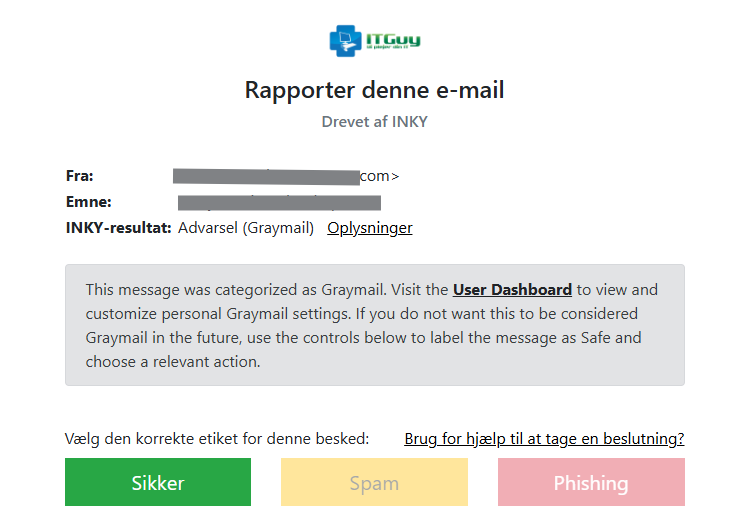Du kan bruge funktionen “Report This Email” (banners Not Graymail Spam Phish More… ) til at give feedback på INKY’s vurdering.